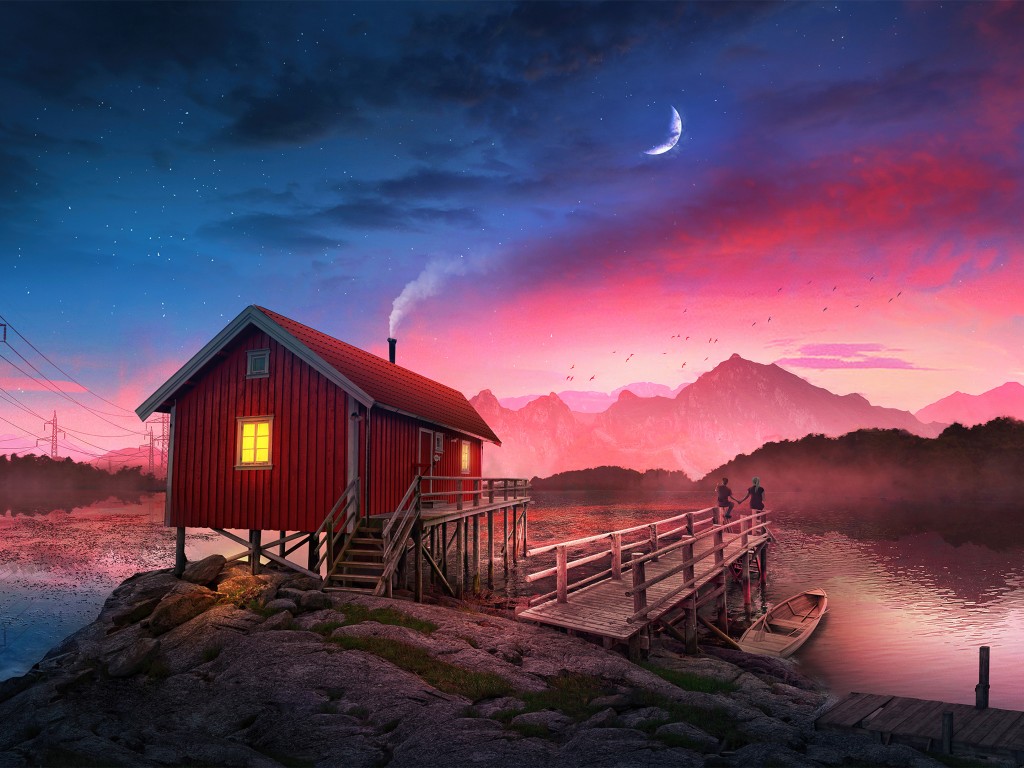 Cozy Cabin Sunset Moon Wallpaper - 1024x768