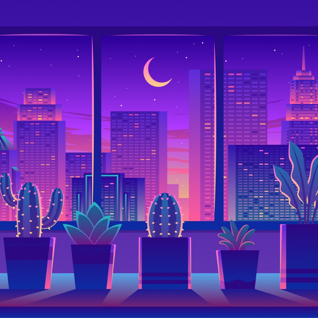 Cityscape Moon Cactus Vector Art Wallpaper - 1024x1024