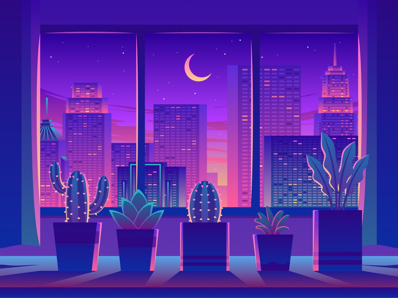 Cityscape Moon Cactus Vector Art Wallpaper - 1280x960