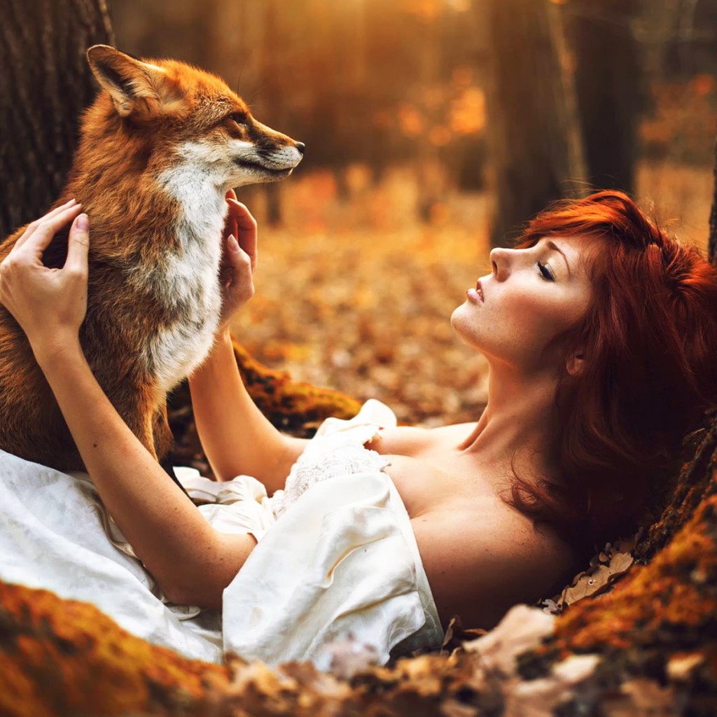 Redhead Women Fox Autumn Forest Wallpaper - 1024x1024