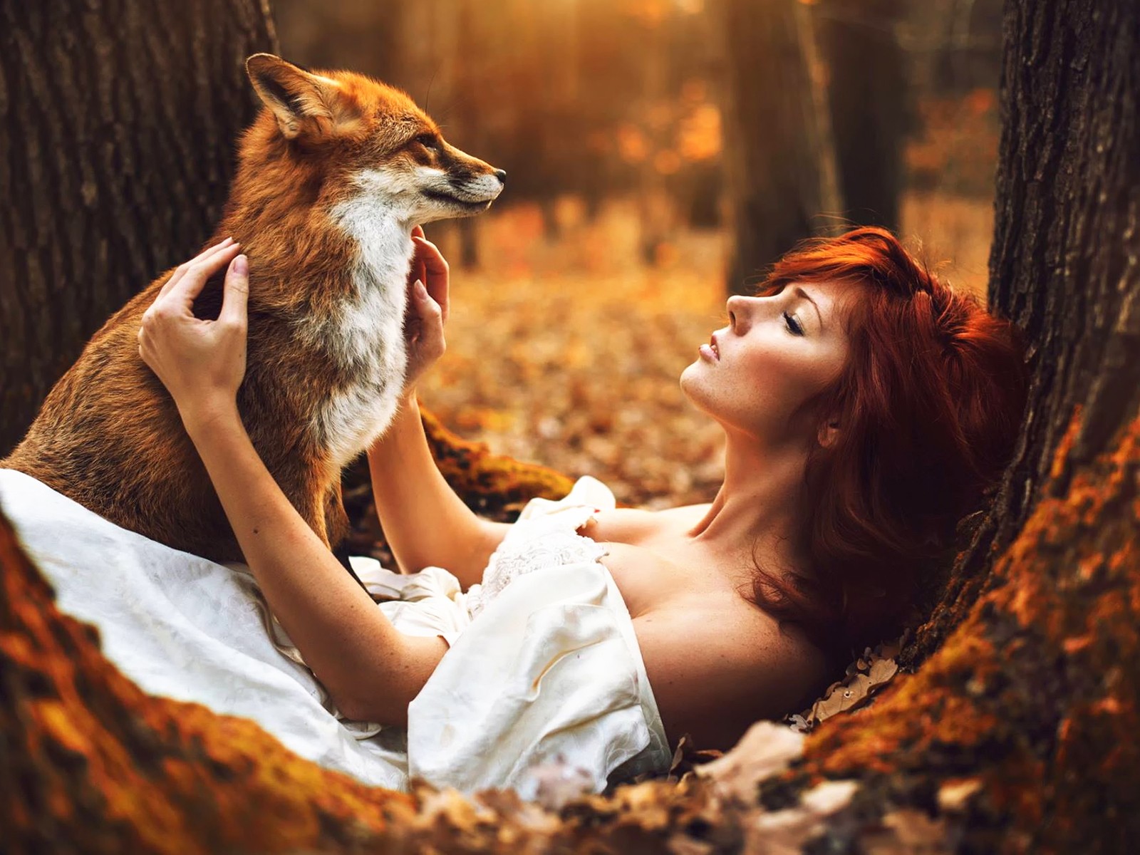 Redhead Women Fox Autumn Forest Wallpaper - 1600x1200