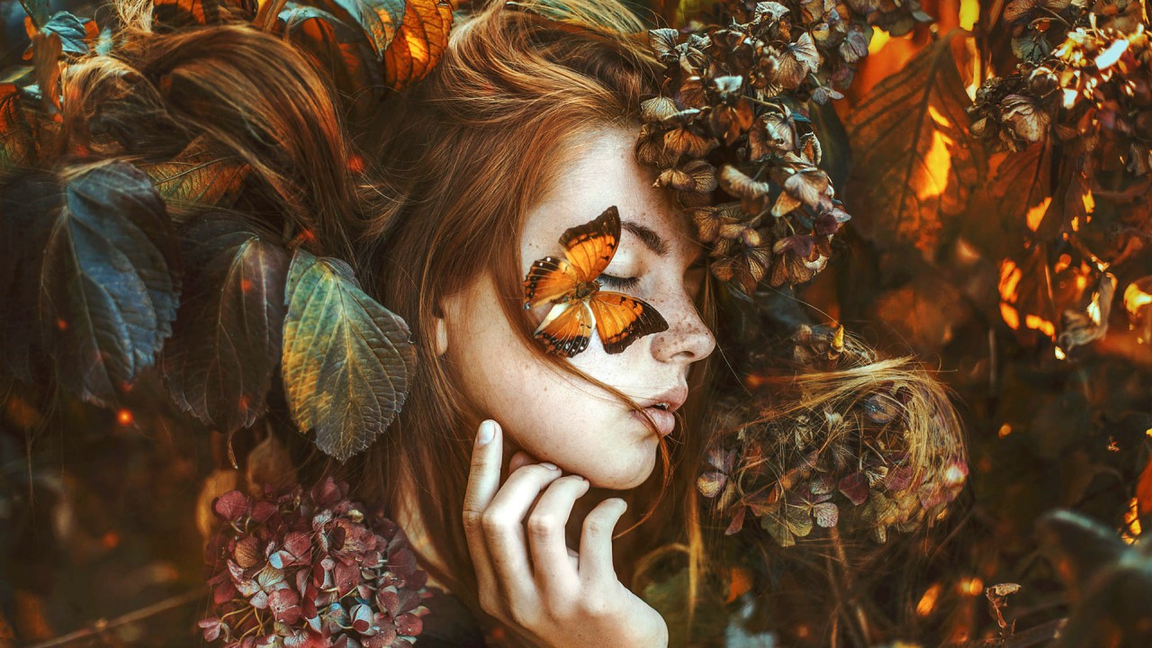 Redhead Women Mood Autumn Butterfly Wallpaper - 1280x720