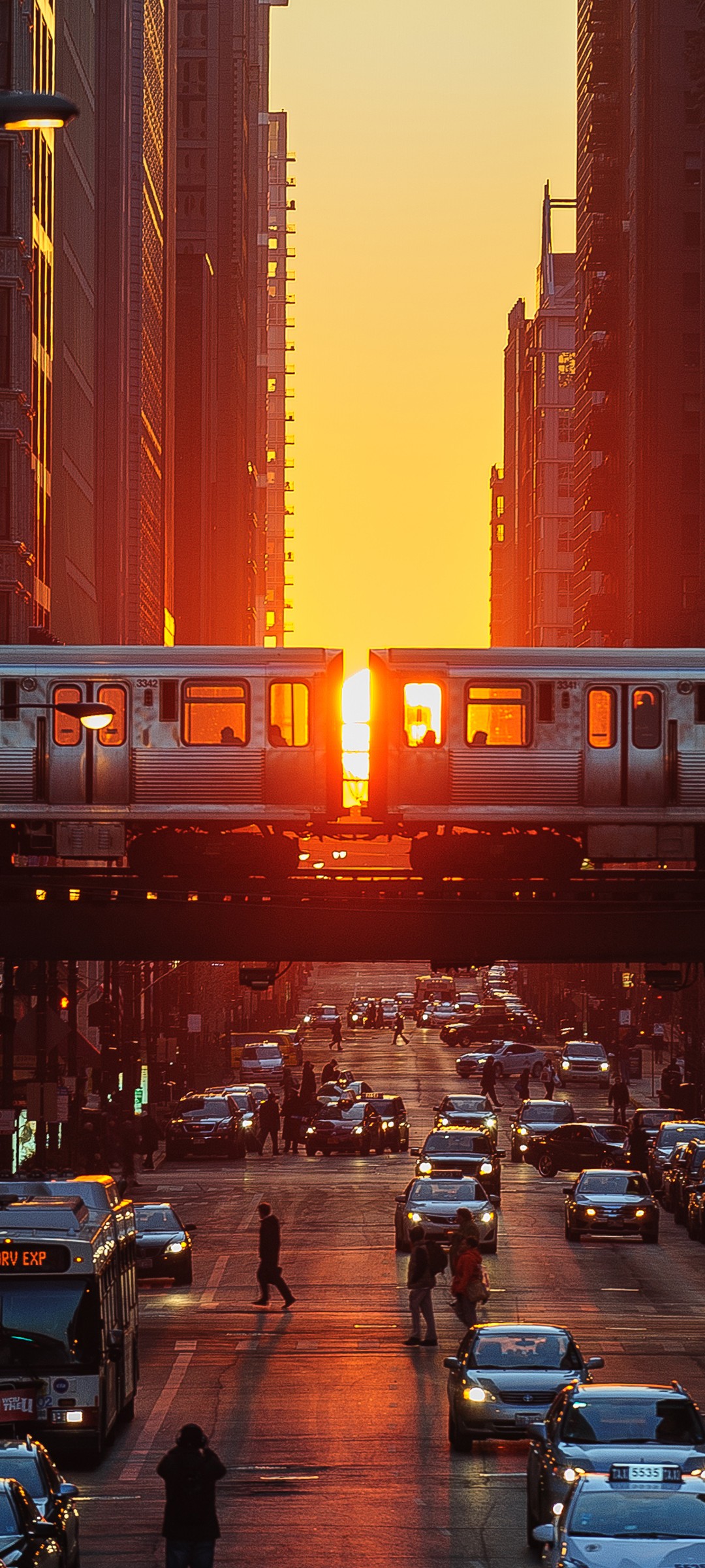 Chicago Streets Cars Train Sun Wallpaper - 1080x2400