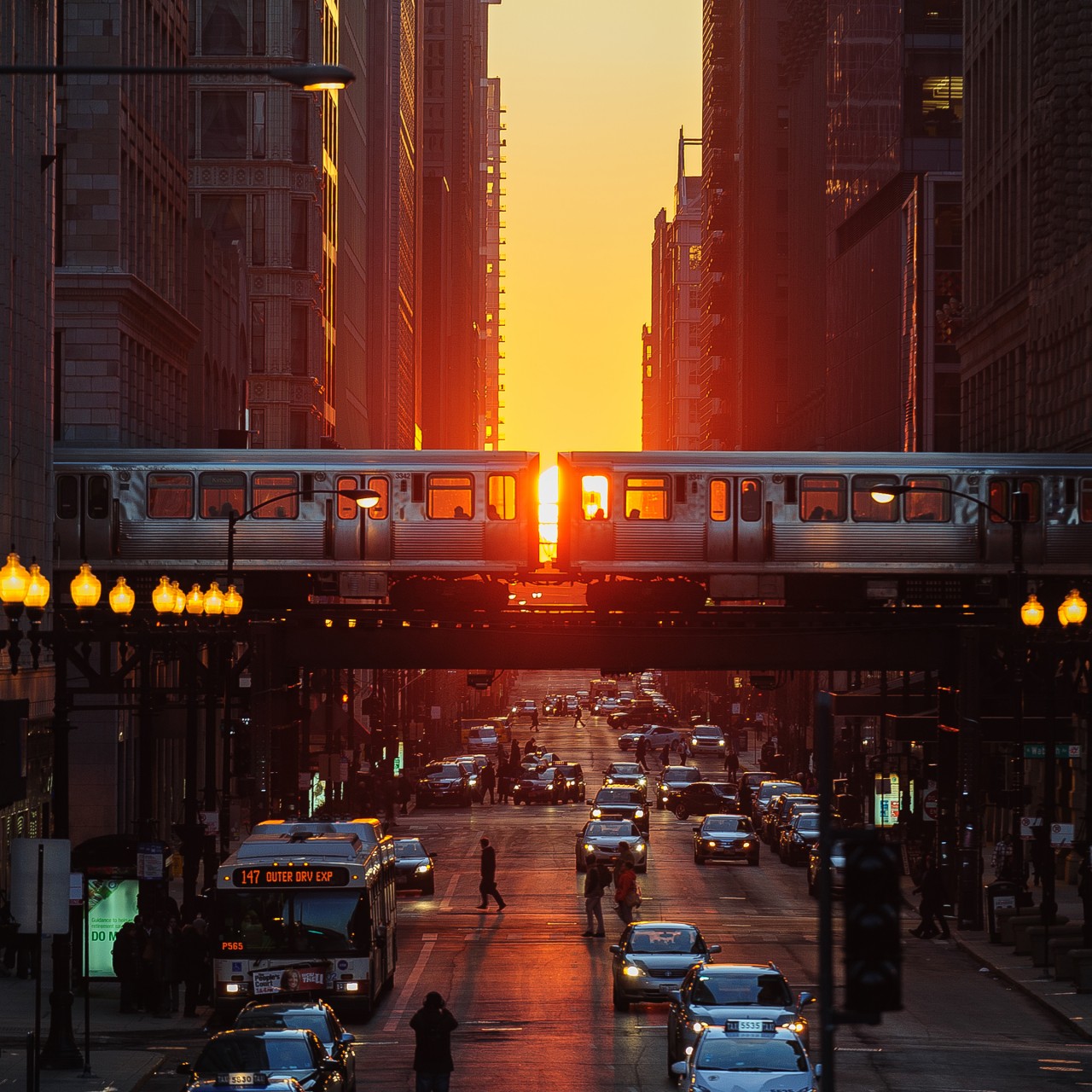 Chicago Streets Cars Train Sun Wallpaper - 1280x1280