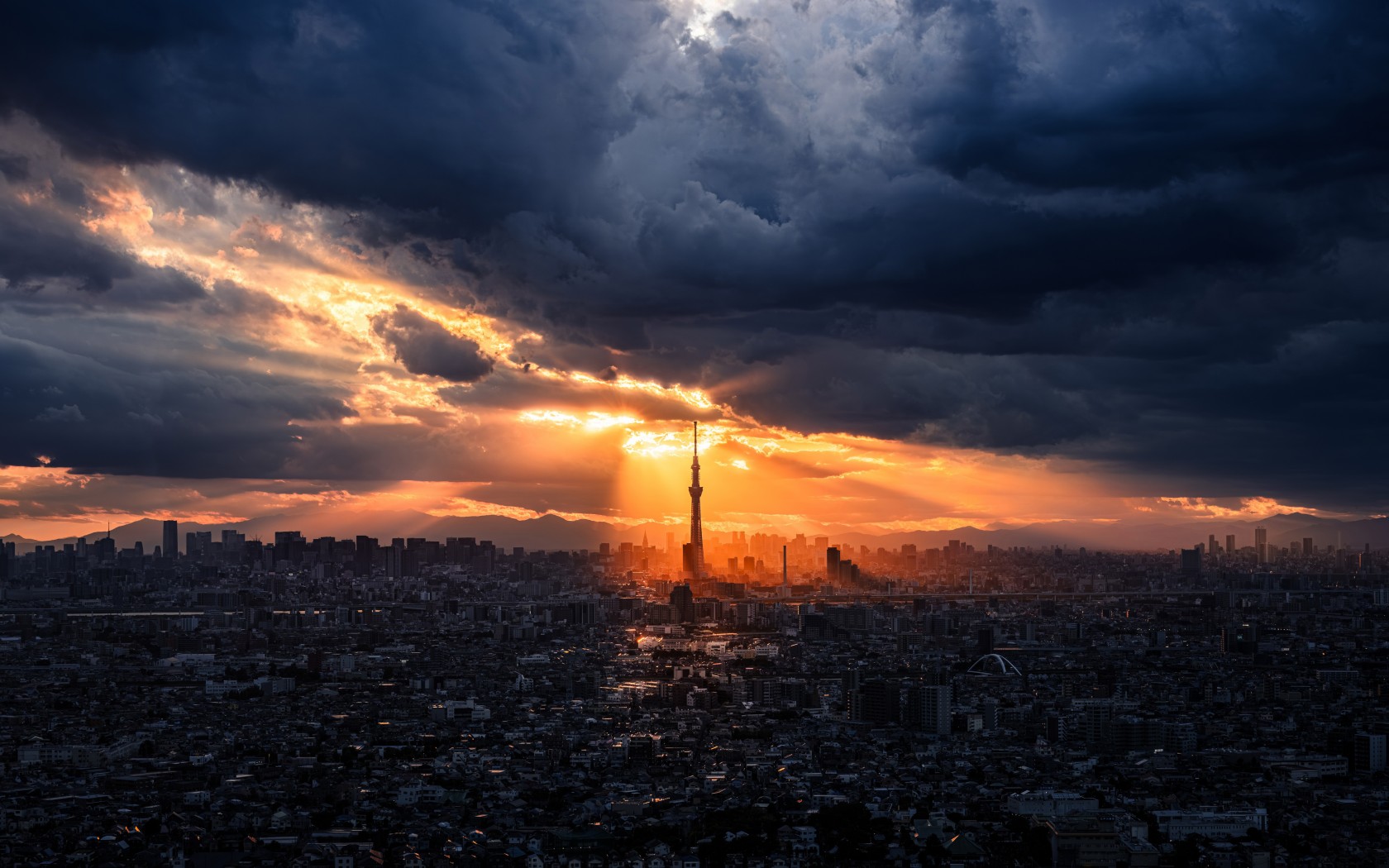 Japan Tokyo Skytree Sun Rays Clouds Wallpaper - 1680x1050